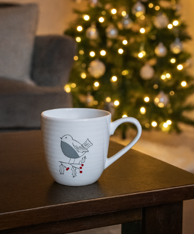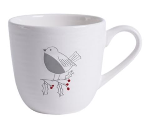 A simple and stylish ceramic mug with a cute robin and holly design.