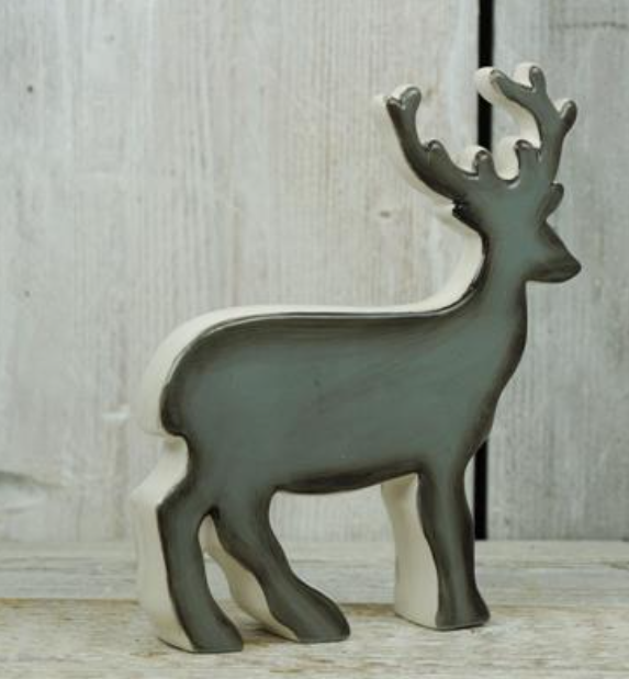 This grey ceramic reindeer measures 16.5 cm across, is 3 cm deep and stands at 18.2 cm high.