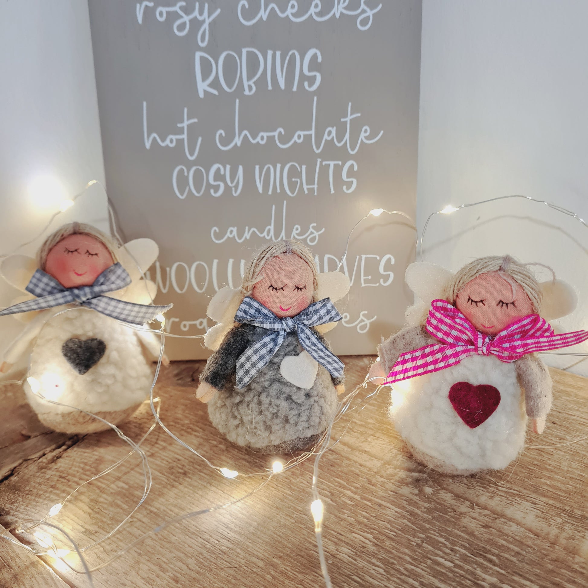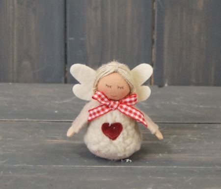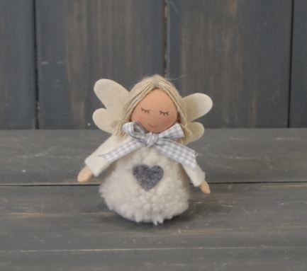 Gorgeous knitted style sitting beanbag type angel with gorgeous neutral colours with cute little embroidered heart - perfect for styling shelves any time of the year