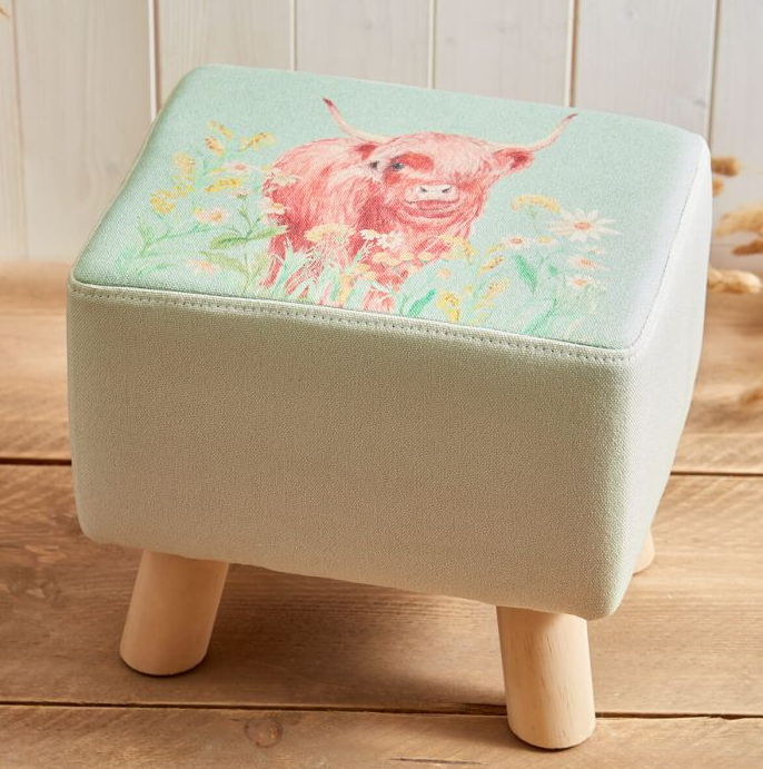 Rectangular stool with a cream-colored fabric seat featuring a printed highland cow and floral design, supported by 4 light wood legs. The fabric top displays yellow, white, and green accents illustrating flowers and grass.