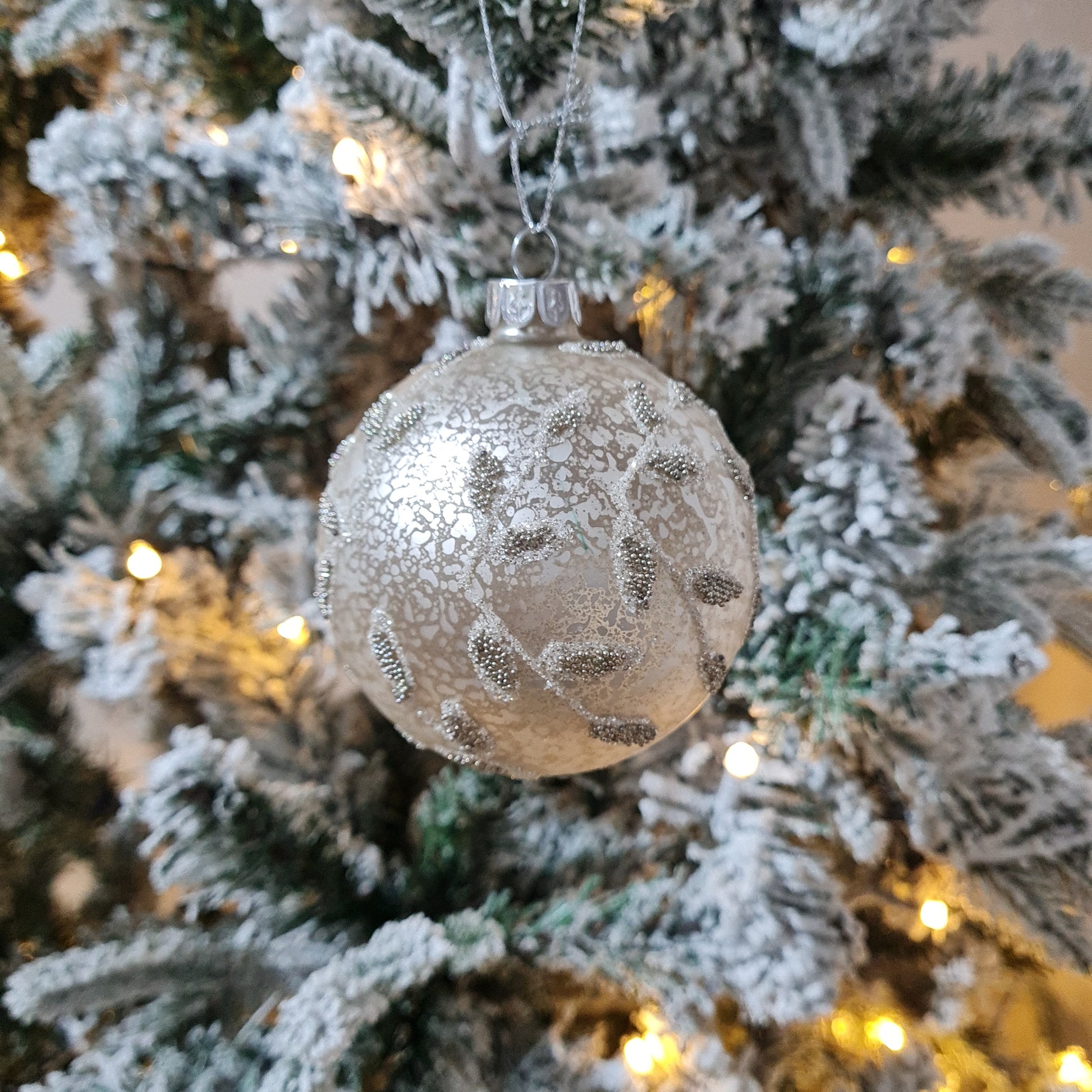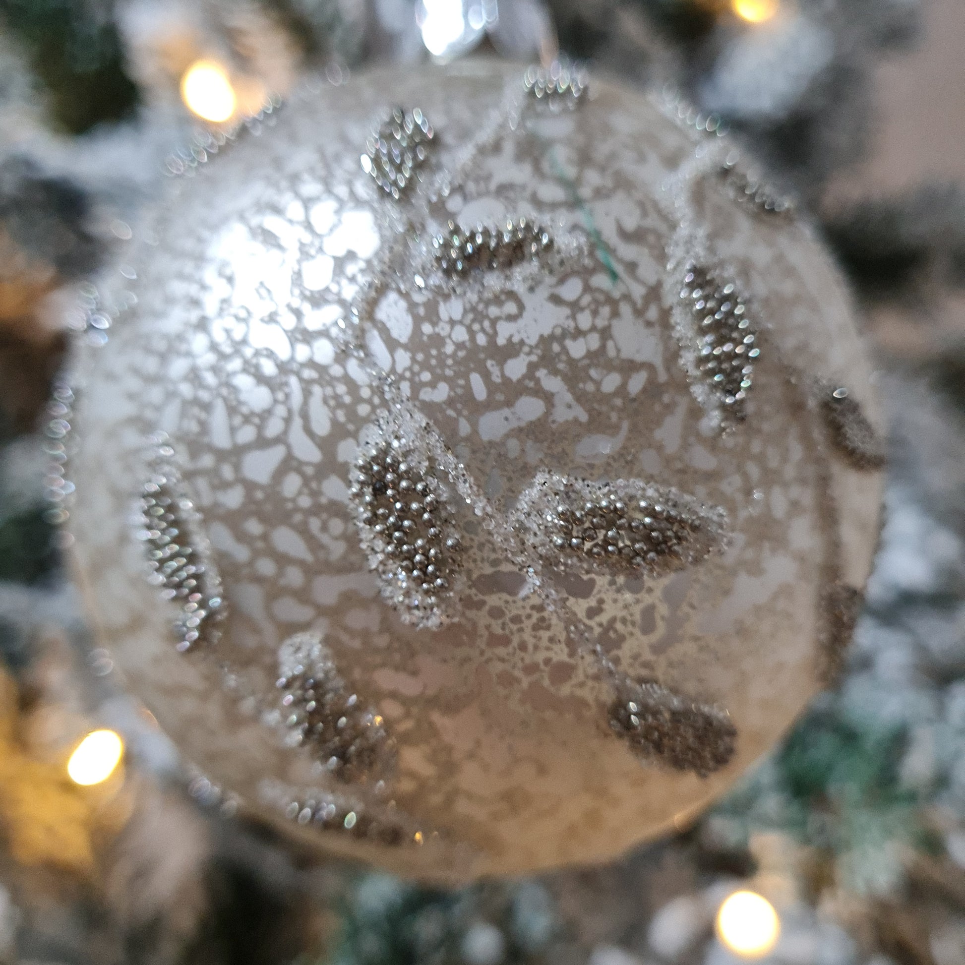 A gorgeous Mottled glass bauble featuring a beaded leaf decal with added glittery touches