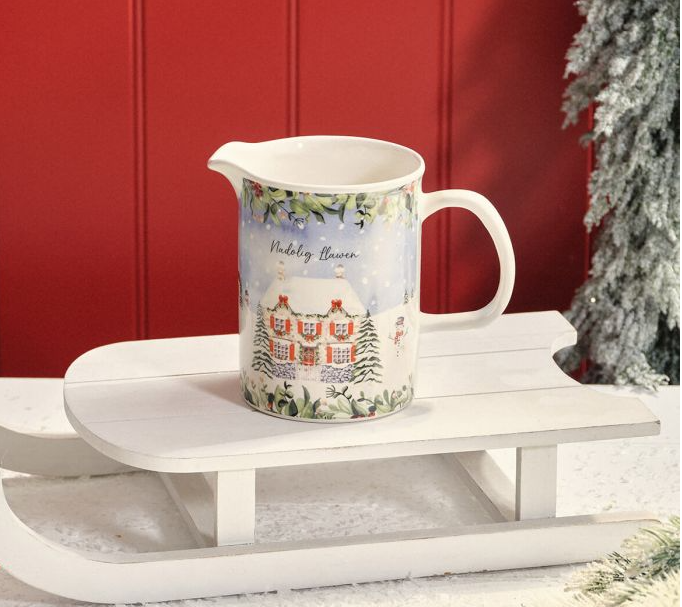 Ceramic jug featuring a Welsh Christmas cottage scene with snow, greenery, and a house decorated for the holiday, predominantly blue, white, and green with red accents. The phrase "Nadolig Llawen" is printed near the top. Jug has a handle and a small spout