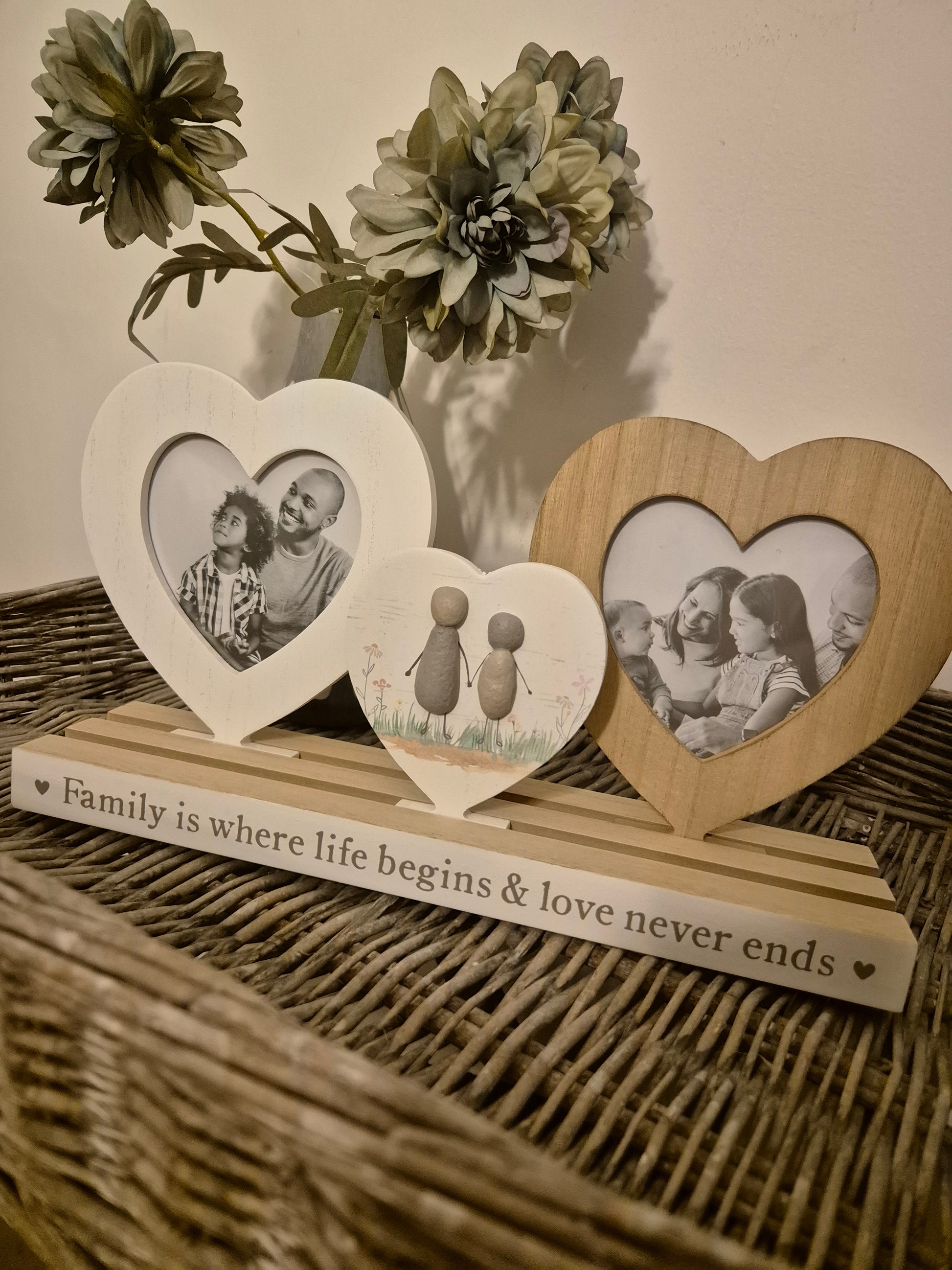 Wooden Plaque With Slots For 2 Heart Frames And Heart Plaque With Pebble Family On