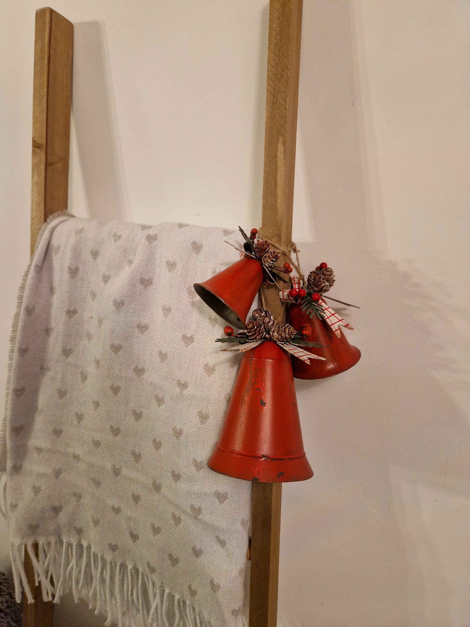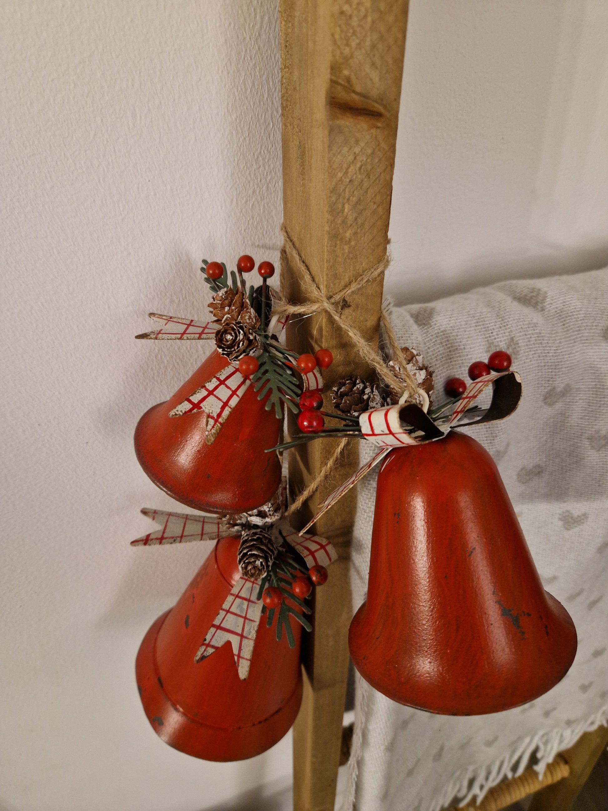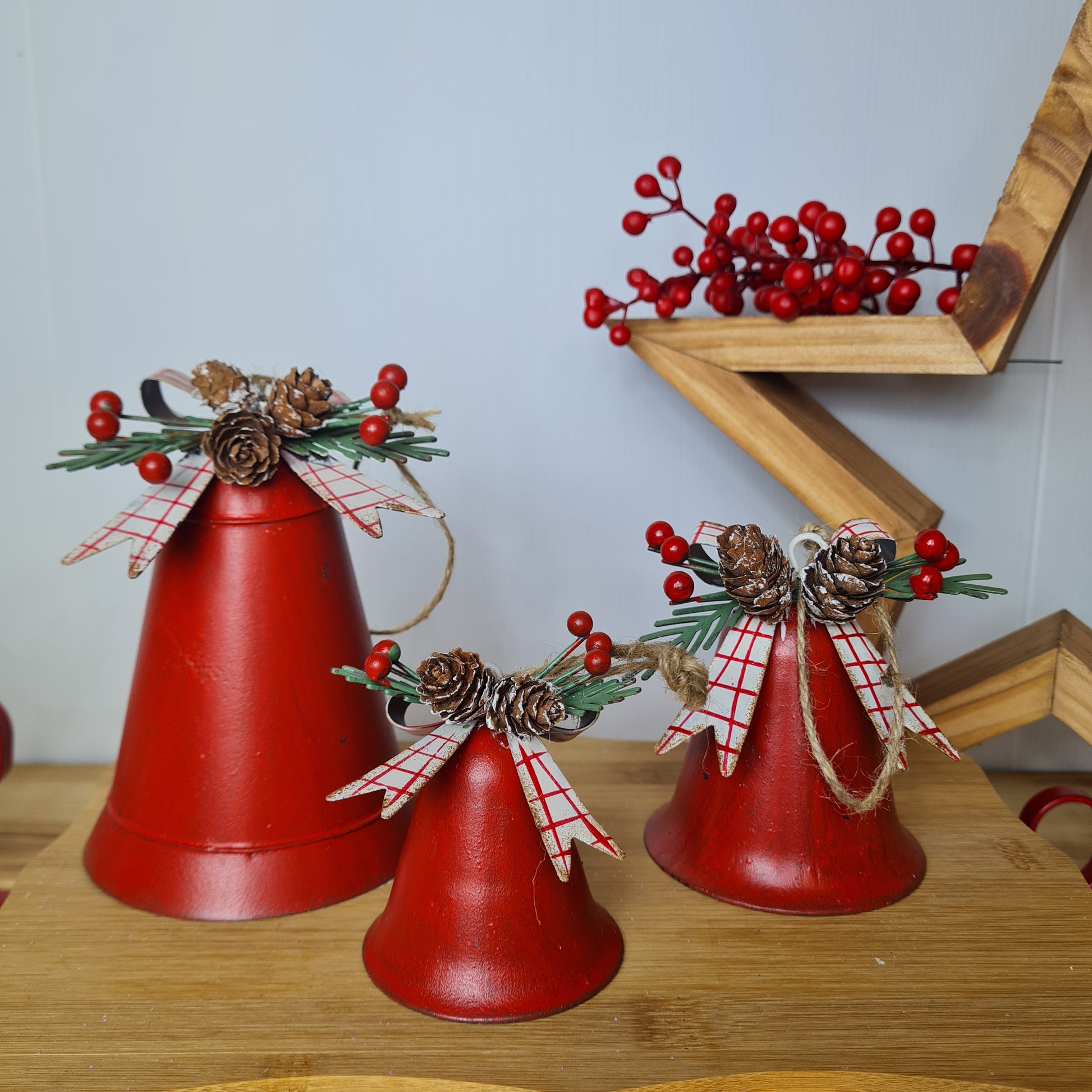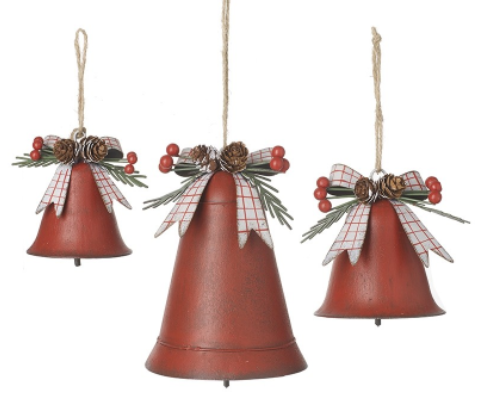 WHITE METAL WITH TARTAN BOWS BELLS SET size bells 8x8x6.2cm & 11x10x8cm & 14.5x11x9.5cm.