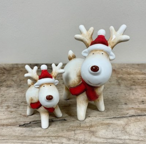A sweet and simple posed ceramic reindeer with red scarf and red nose!