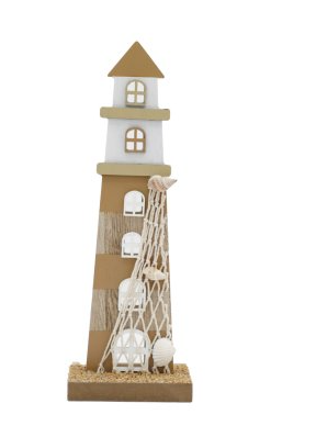 Add a touch of coast to the home interior with this lighthouse ornament in wood. It details a sandy colour tone with cut out windows and shells hung from rope.