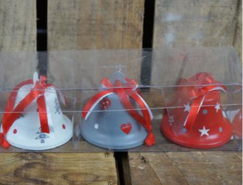Set of three red, grey and white open metal bell ornaments with hearts, spots or trees.