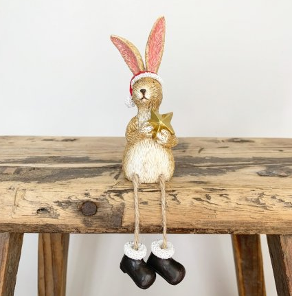 A wonderfully detailed sitting rabbit decoration, complete with a Santa hat, boots and gold star.