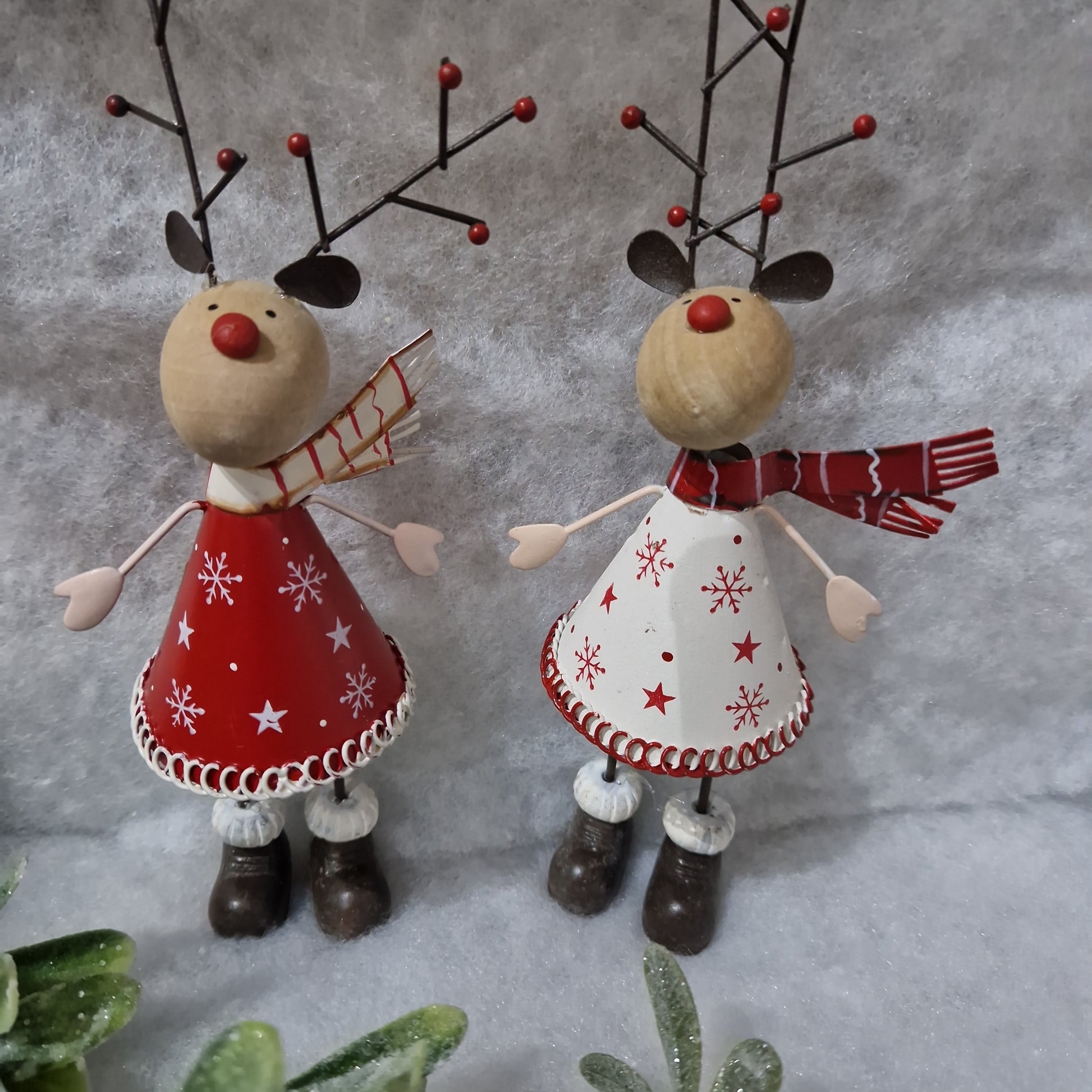 Red and White Metal standing deer's with snowflake print dress with pretty striped scarves