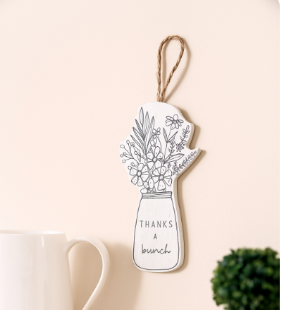 Crafted from MDF, the plaque is the shape of a vase of flowers which are seen in detail via an illustration. The heartfelt listed words are, ‘THANKS A bunch.’