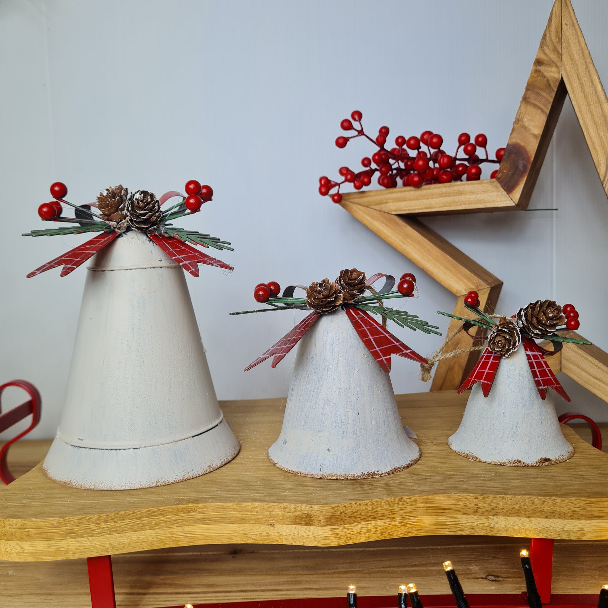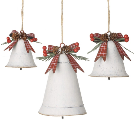 WHITE METAL WITH TARTAN BOWS BELLS SET size bells 8x8x6.2cm & 11x10x8cm & 14.5x11x9.5cm.