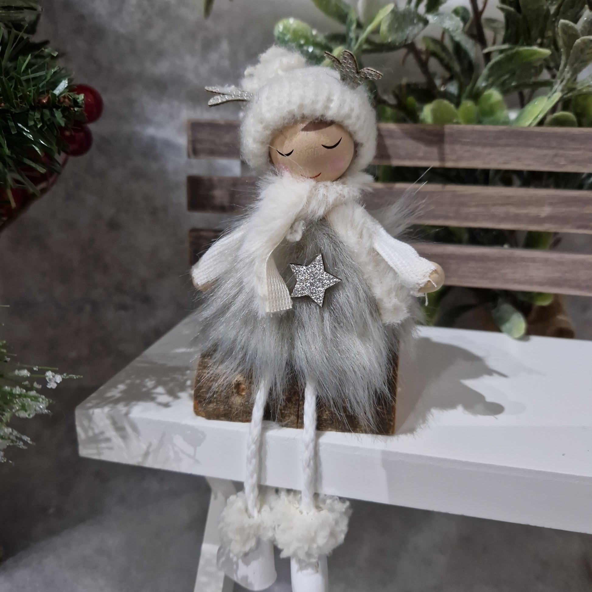 Gorgeous grey and white fluffy winter girl sitting on wooden log with scarf and hat