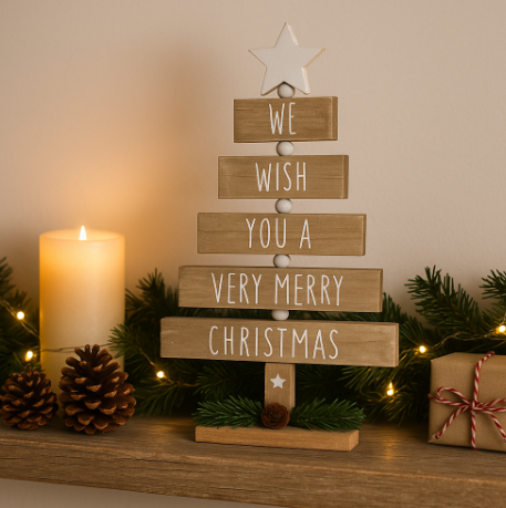Gorgeous wooden tree block with scripted text We Wish You A Merry Christmas