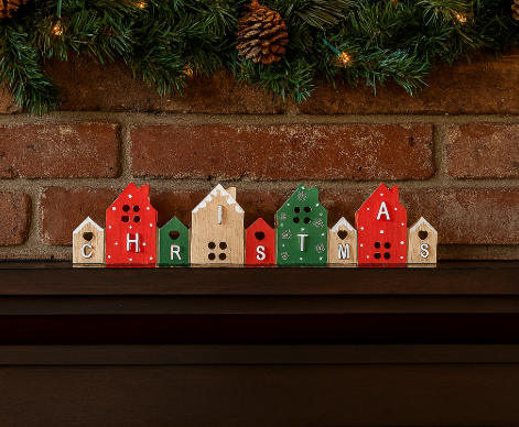 A village of cute wooden houses join together to spell Christmas. A beautiful nordic design with a handmade aesthetic. Complete with adorable heart details, polka dots and snow.